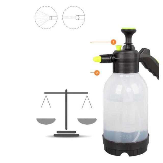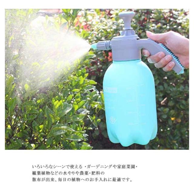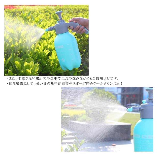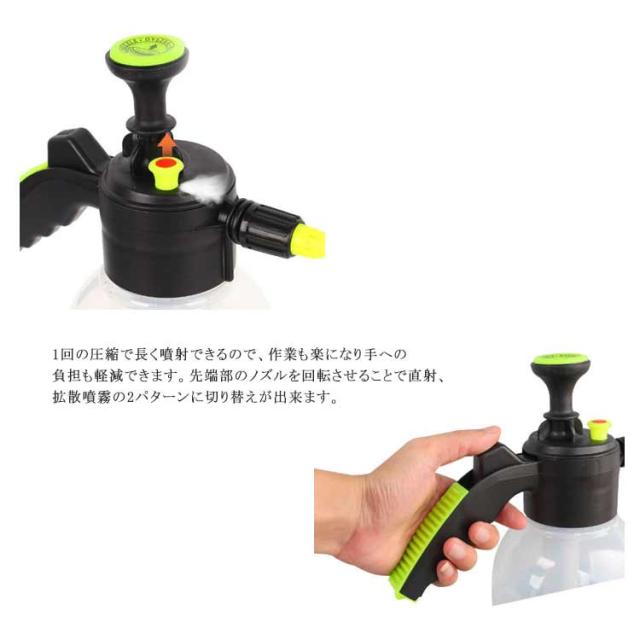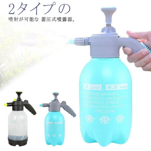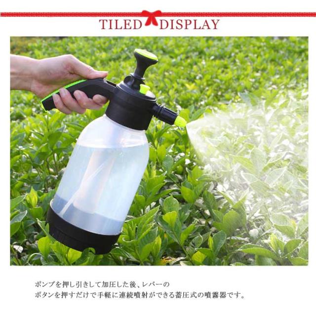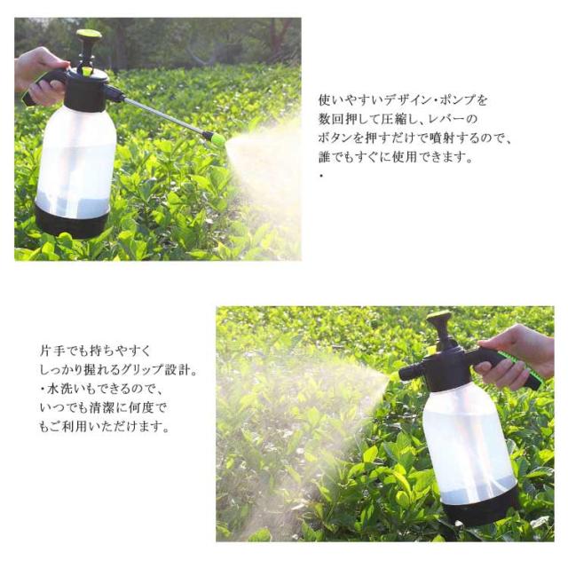 | 2タイプの噴射が可能な 蓄圧式噴霧器。 ポンプを押し引きして加圧した後、レバーのボタンを押すだけで手軽に連続噴射ができる蓄圧式の噴霧器です。 1回の圧縮で長く噴射できるので、作業も楽になり手への負担も軽減できます。先端部のノズルを回転させることで直射、拡散噴霧の2パターンに切り替えが出来ます。 いろいろなシーンで使える ・ガーデニングや家庭菜園・観葉植物などの水やりや農薬・肥料の散布が出来、毎日の植物へのお手入れに最適です。・また、水道がない場所での洗車や工具の洗浄などにもご使用頂けます。・拡散噴霧にして、暑い日の熱中症対策やスポーツ時のクールダウンにも! 使いやすいデザイン・ポンプを数回押して圧縮し、レバーのボタンを押すだけで噴射するので、誰でもすぐに使用できます。・片手でも持ちやすくしっかり握れるグリップ設計。・水洗いもできるので、いつでも清潔に何度でもご利用いただけます。 | |