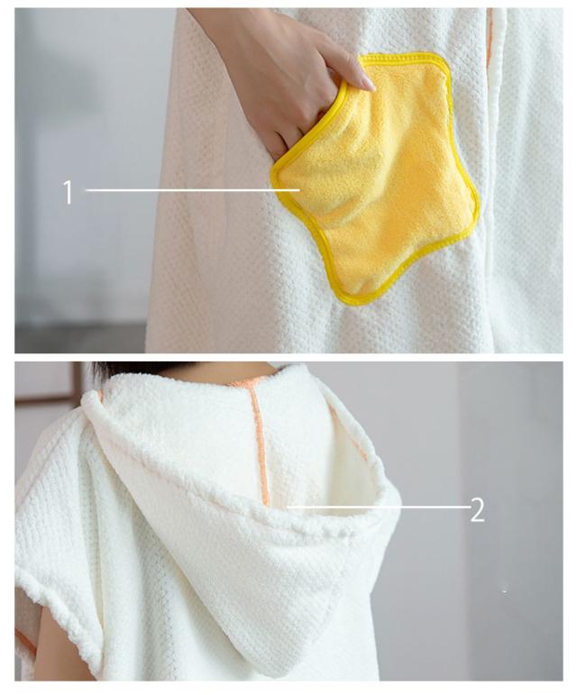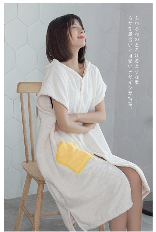 | お風呂から上がって体を拭かずにサッと着るだけ。 大人気の吸水速乾タオルの素材で作ったフード付きバスローブ。 ふわふわのとろけるような柔らかな風合いと可愛いデザインが特徴。 着用後に軽く押さえるだけで水分を吸い取ってくれるので、どうしても忙しくなってしまうお子様とのバスタイムもこれ1枚でかなりの時短になるうれしいアイテムです。 バスローブではなくルームウェアや部屋着、パジャマとしてももちろんお使いいただけます。 素材やデザインは季節関係なくオールシーズンお使いいただけます。 出産祝いやプレママへのプレゼントまた入院中の方へのお見舞い、腕が上げづらいかたにも大変喜ばれるお品です。 | |