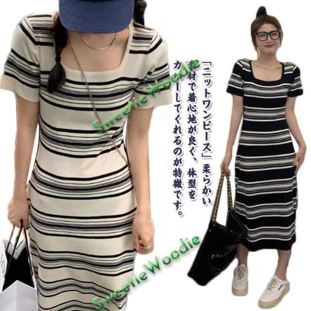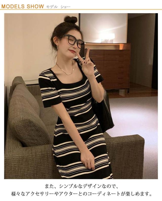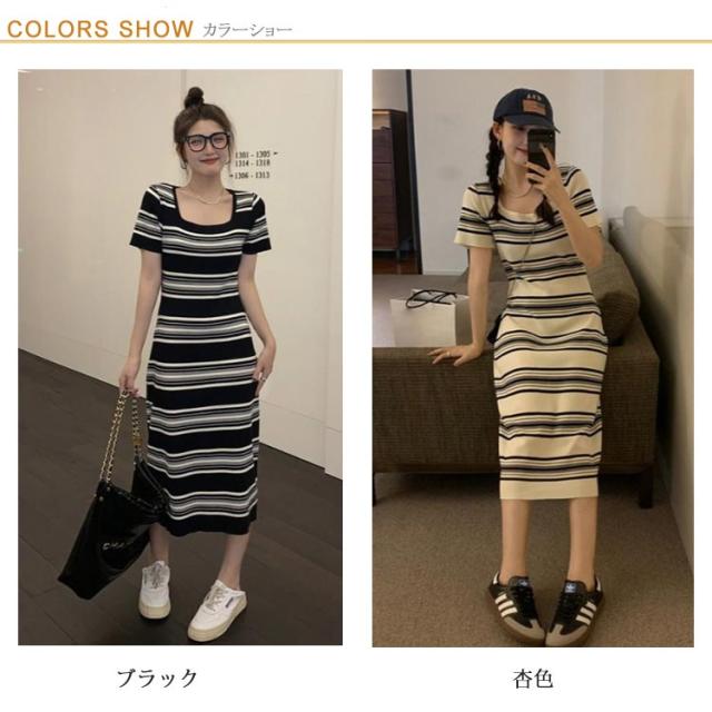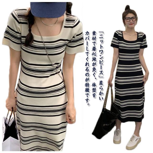 送料無料 春 夏ワンピース 半袖 ショートスリーブ ストライプ スクエアネック ニットワンピース フレンチスタイル雰囲気 Aライン 上品 韓国 きれいめ サマーニット タイト ボーダー カジュアル パーティードレス