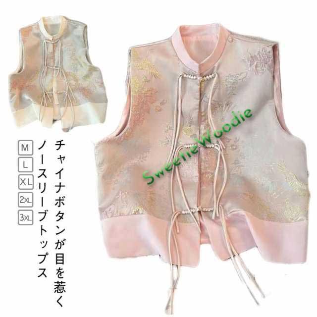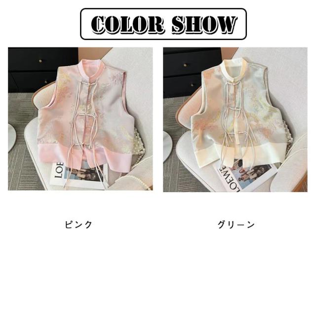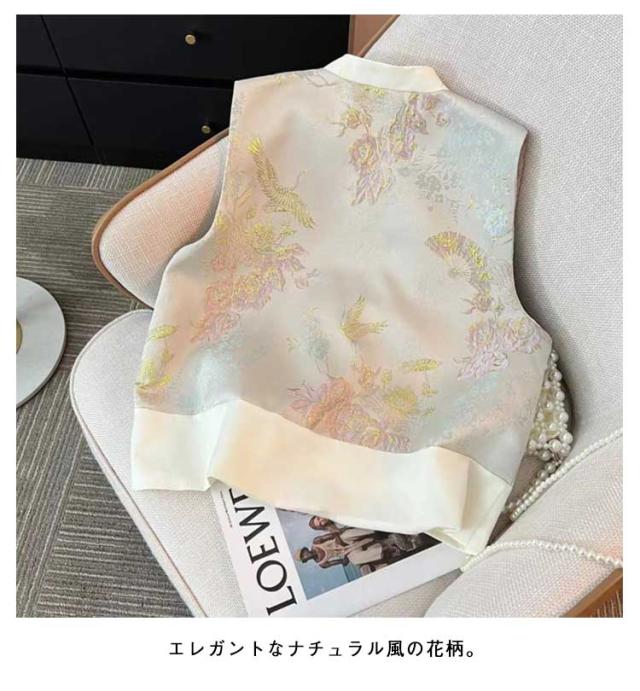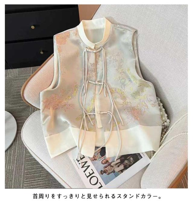 ベスト チャイナボタン トップス ノースリーブ レディース 春 夏 秋 冬 ベスト ジレ チャイナベスト チャイナジレ 唐装 前開き スタンドカラー ミドル丈 中華風 刺繍 花柄 タッセル ジャカード ツヤ サマージャケット 羽織り