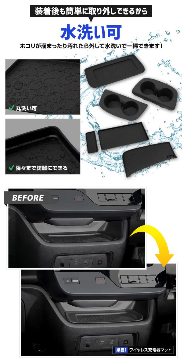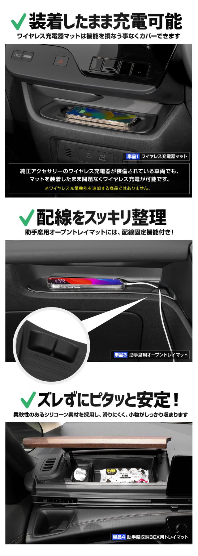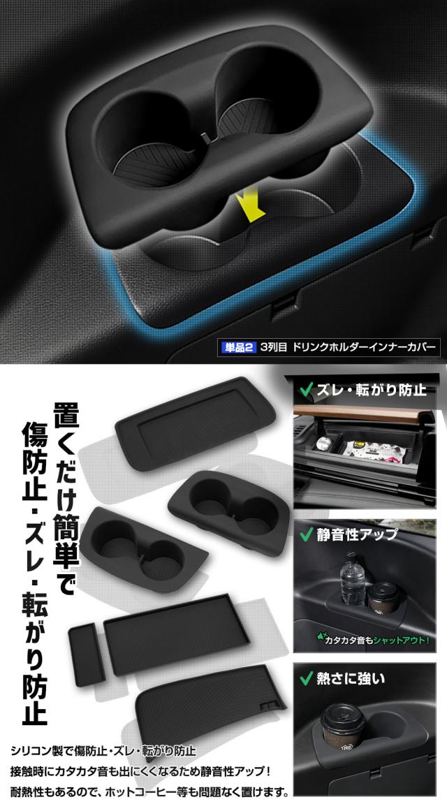 | セット[4]ワイヤレス充電器マット + 3列目ドリンクホルダーインナーカバー + 助手席用オープントレイマット + 助手席収納BOX用トレイマット [1]ワイヤレス充電器マット 1PCS [2]3列目ドリンクホルダーインナーカバー 2PCS [3]助手席用オープントレイマット 1PCS [4]助手席収納BOX用トレイマット 2PCS |