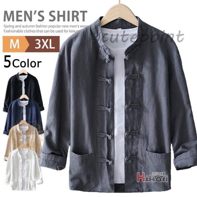 リネンシャツ メンズ 長袖シャツ チャイナ服 チャイナボタン チャイナシャツ スタンドカラー バンドカラー トップス 春 夏 秋