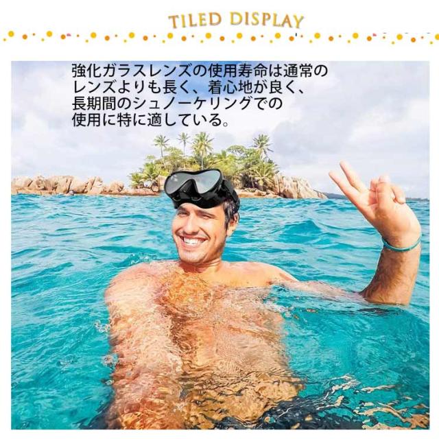 | 強化ガラスレンズの使用寿命は通常のレンズよりも長く、着心地が良く、長期間のシュノーケリングでの使用に特に適している。 シュノーケルメガネは調整可能なので、サイズを簡単に調整して顔にフィットできます。 軽量だから長時間の着用でも疲れにくい。 カーブレンズが180°歪みのないパノラマビジョンを実現。 | |