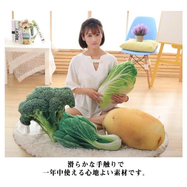 | お部屋にポップな印象を!リアルな野菜のクッションです! 滑らかな手触りで一年中使える心地よい素材です。 厚みがあるのでふかふかの使い心地に!形も崩れにくい。 お部屋、ソファ、車などに置いておくのも可愛い抱き枕です。 | |