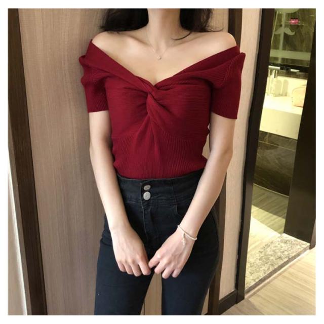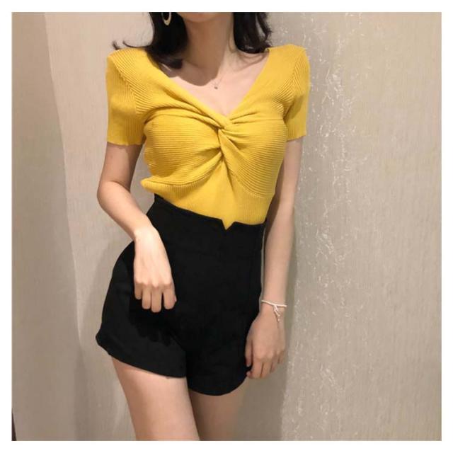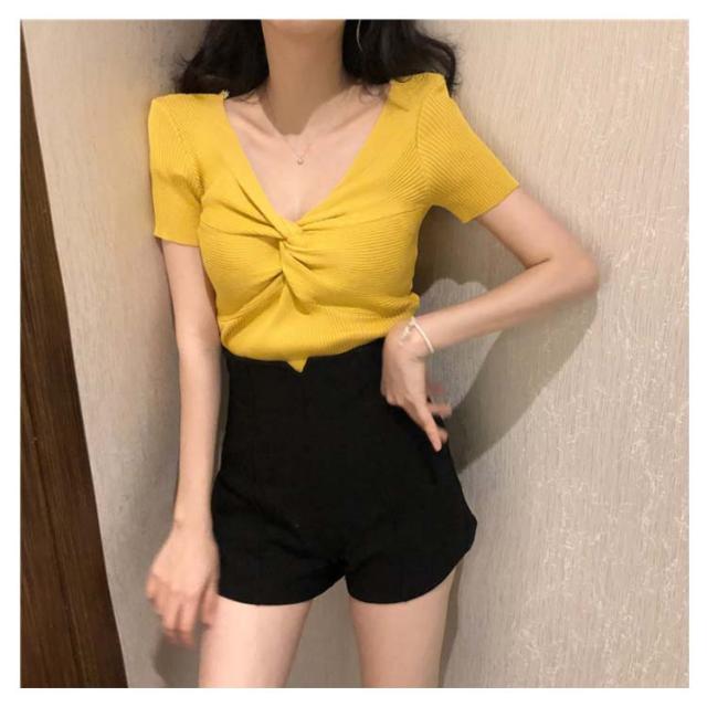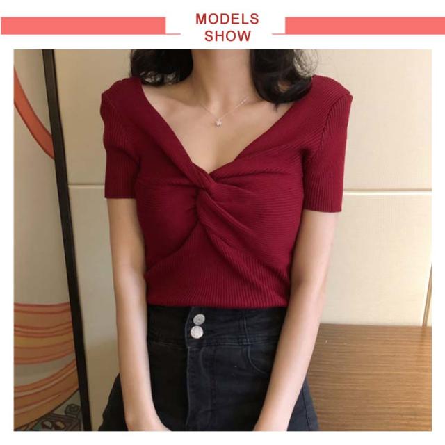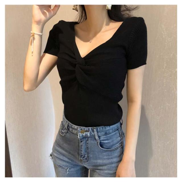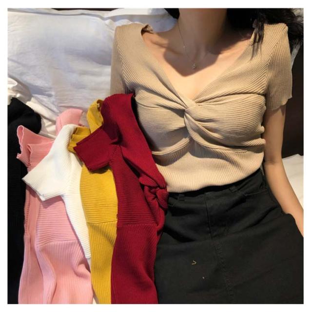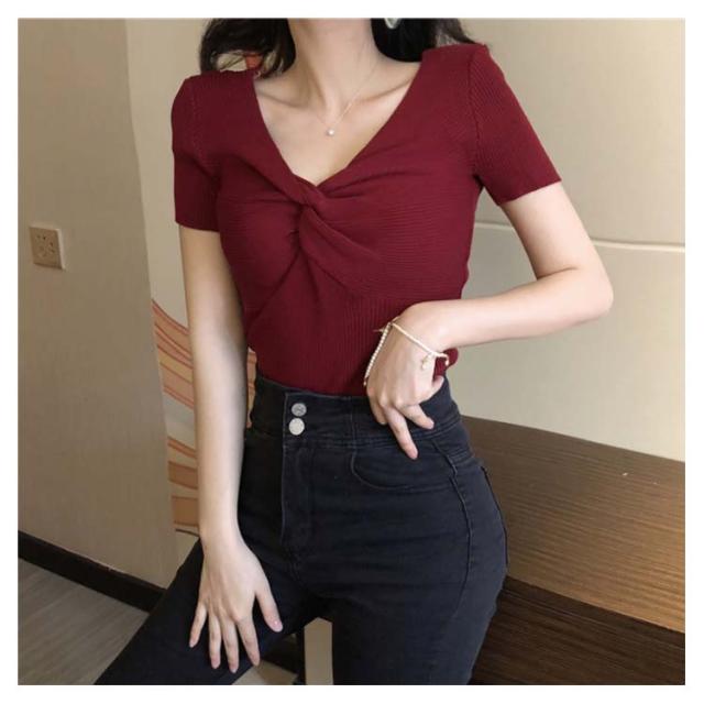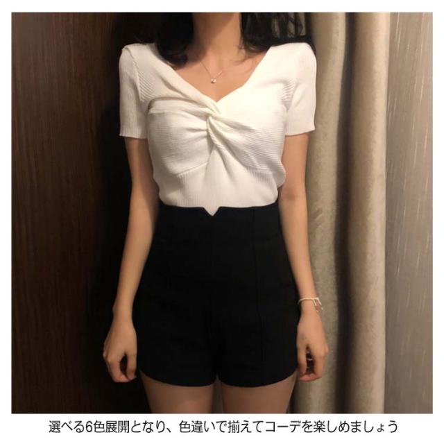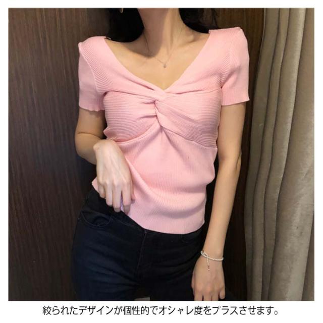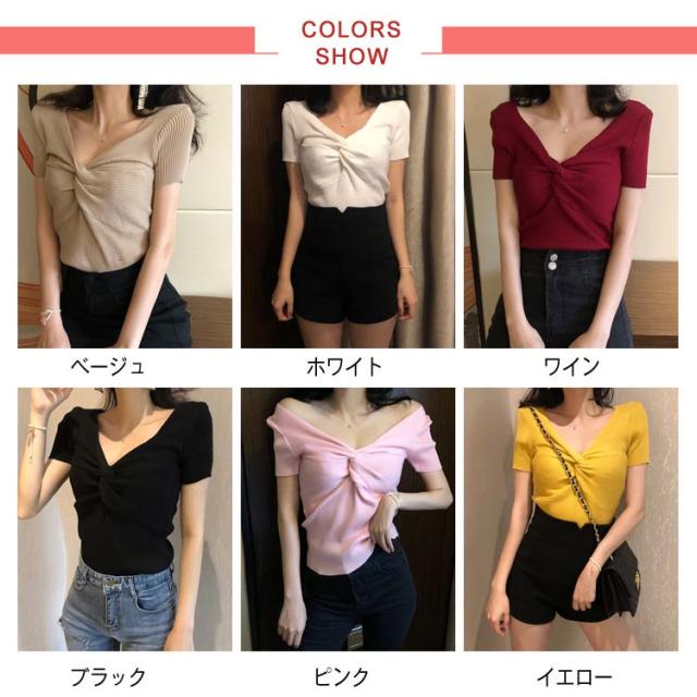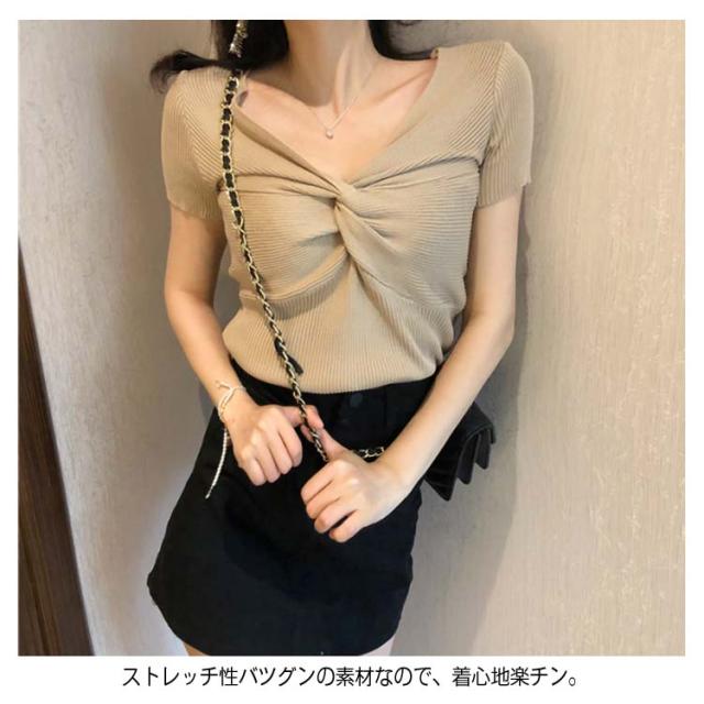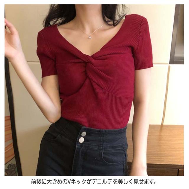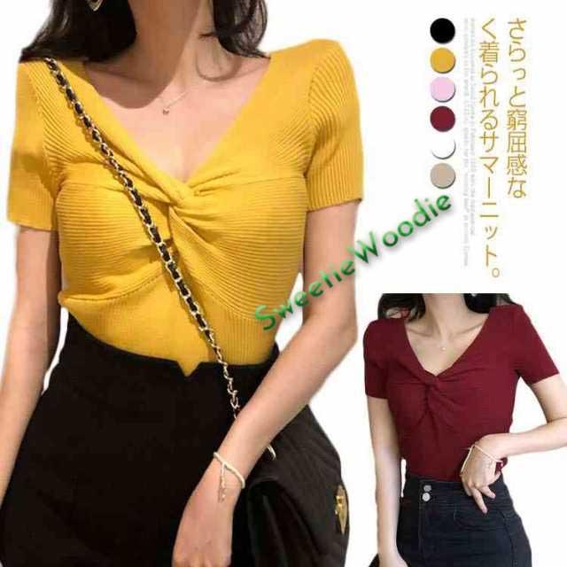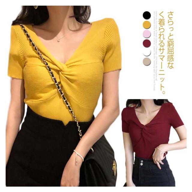 6色展開 サマーニット 半袖 トップス レディース 着痩せ お洒落 Vネック セクシー 無地 薄手 夏服 新作 絞り送料無料