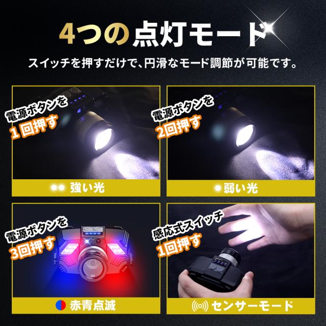 【180日保証】LEDヘッドライト 超高輝度 四つ点灯モード LED ライト USB充電式 防水 防塵 耐衝撃 作業灯 夜釣り 登山 アウトドア ledライト 小型 超軽量 超明るい 地震対策 停電 緊急時 防災グッズ