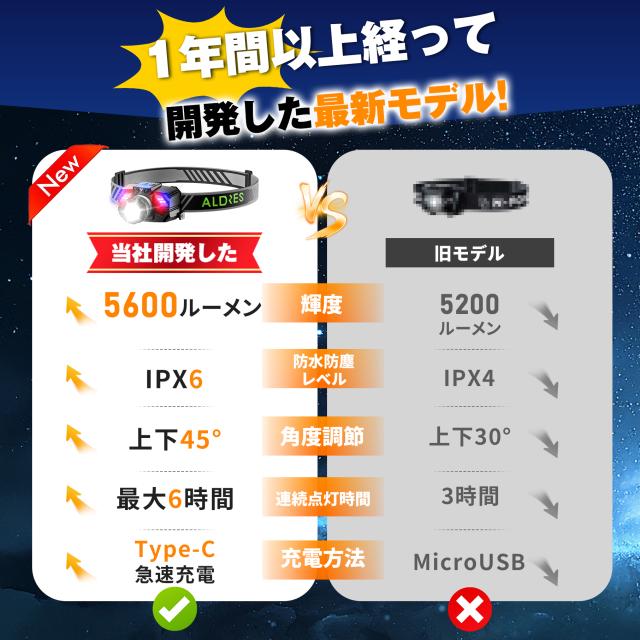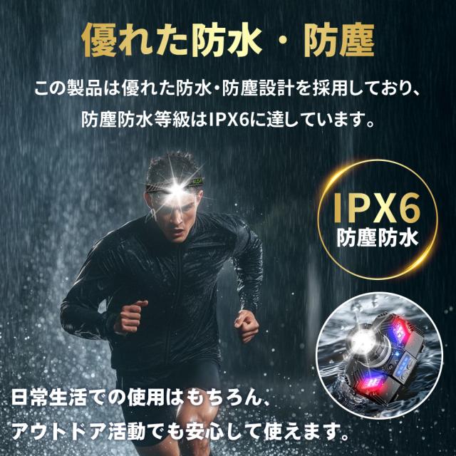 IPX6級防水防塵設計を採用し、悪天候にあっても安心して使えるヘッドライトです!大雨、地震、停電など万が一の時に防災用品としても十分にお使いいただけます。