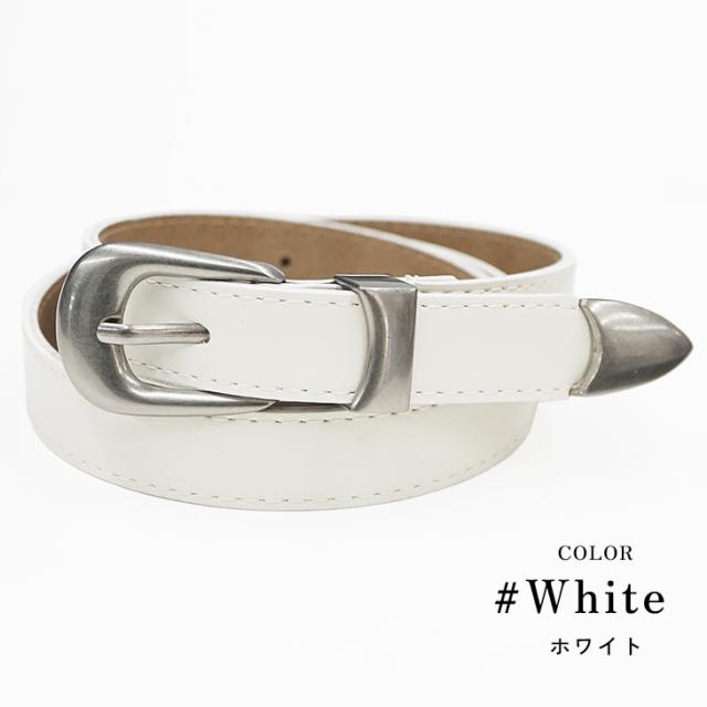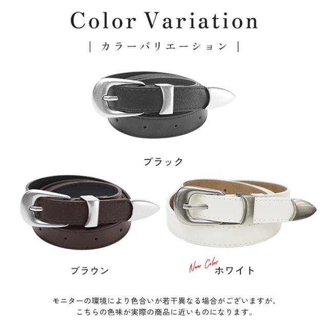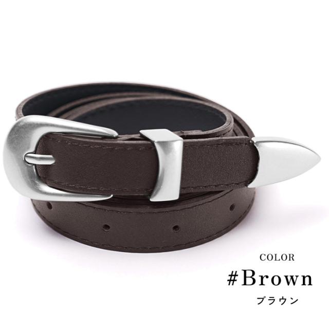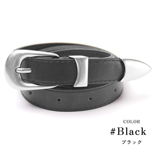柔らかなPUレザーを使用した、しなやかな質感のナローベルト。ウエスタンベルトのような剣先やバックルを取り入れ、シンプルながらも「魅せる」デザインに。ベルト穴も14個と多く、細身の方でも安心して使用でき、細かなサイズ調整も可能です。