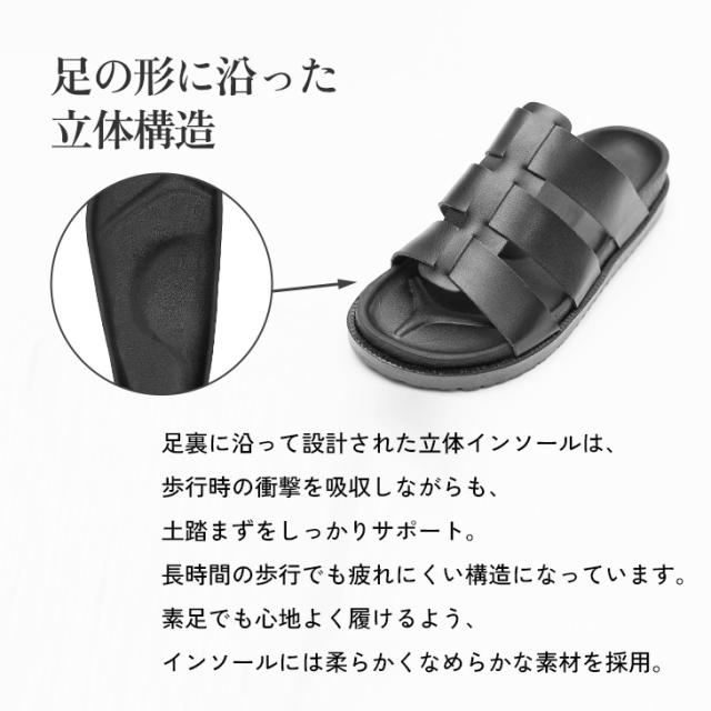 クッション性と形状にこだわって設計された立体インソールによって歩行の際の衝撃を吸収し長時間の着用でも疲れにくい構造に。