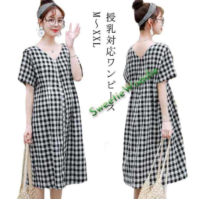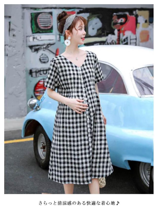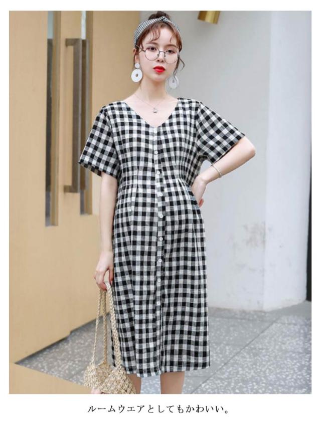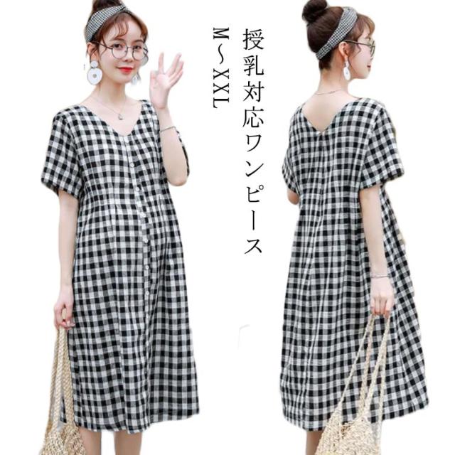 マタニティワンピース 半袖 前開き 産前 産後 授乳服 ギンガム チェック 夏 授乳パジャマ マタニティ? パジャマ ワンピース フロント 授乳 ルームウェア ロング 妊娠 出産 プレゼント 送料無料