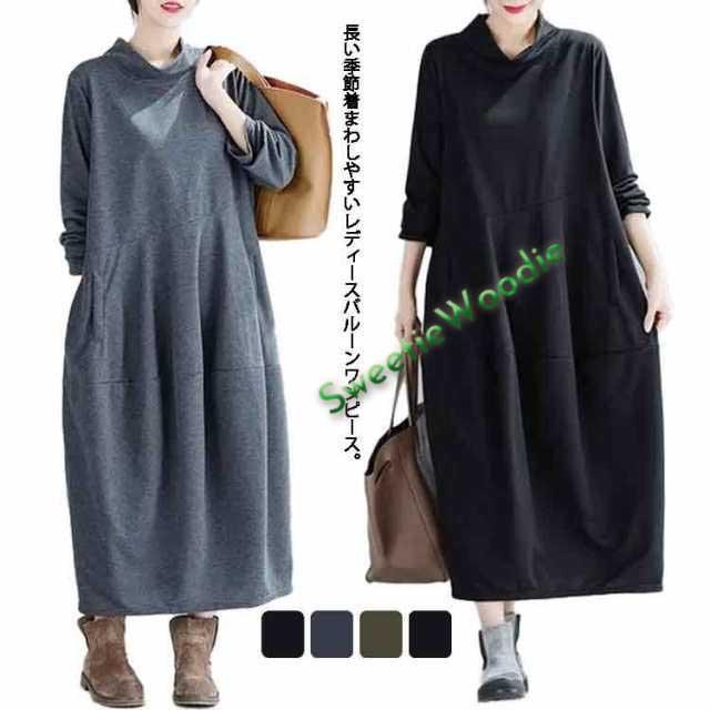 バルーンワンピース モックネック 秋冬 ワンピース ミモレ丈 ロングワンピース コクーン コクーンワンピース バルーン ワンピース 長袖 ロング丈 プルオーバー ゆったり ポケット付き M L XL 2XL