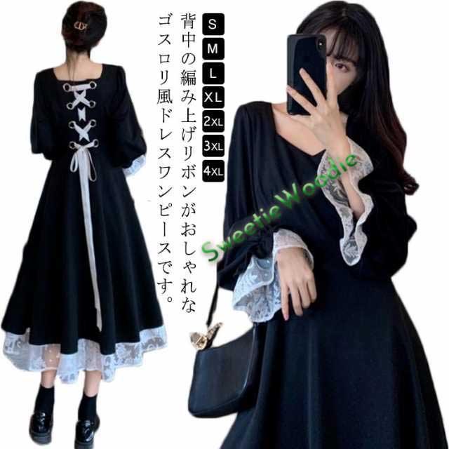 お出かけ お嬢様 ロリータ ワンピース ロング レース切り替え パーティードレス S?4XL!ゴスロリ 長袖 バック編み上げリボン パーティー コスプレ キレイめ 30代 40代