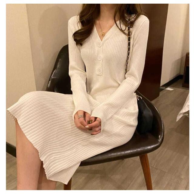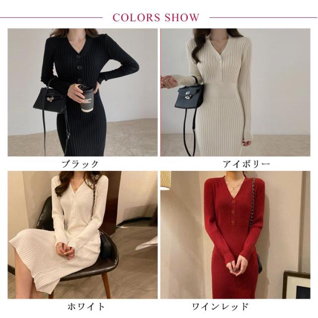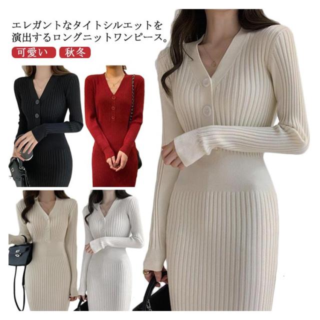 ニット レディース ニットワンピース ワンピース ニットワンピース Vネック リブニット タイト リブ編み タイトワンピース 秋冬 可愛い ロング 細身 ロングワンピース 膝丈 フロントボタン ストレッチ 大人 スリム きれいめ おしゃれ 無地 シンプル