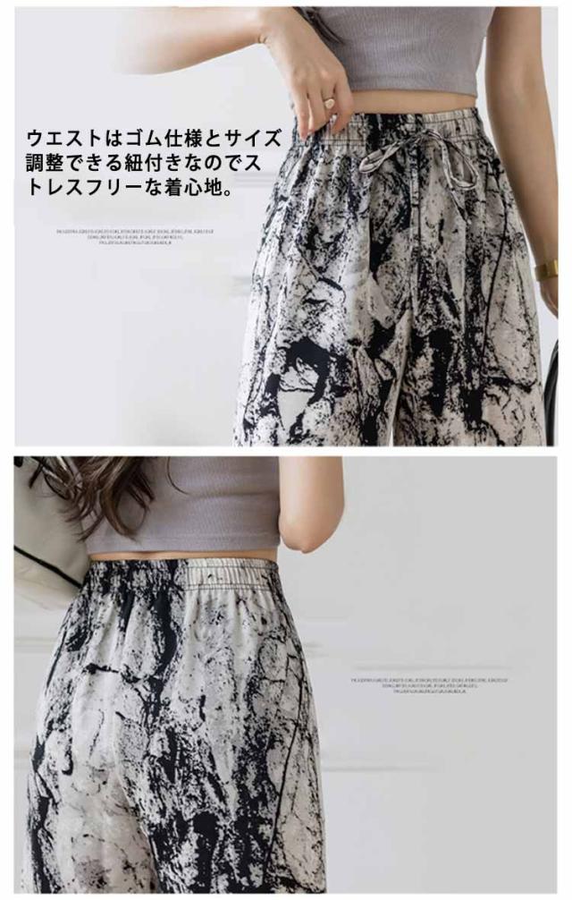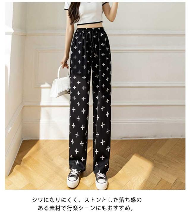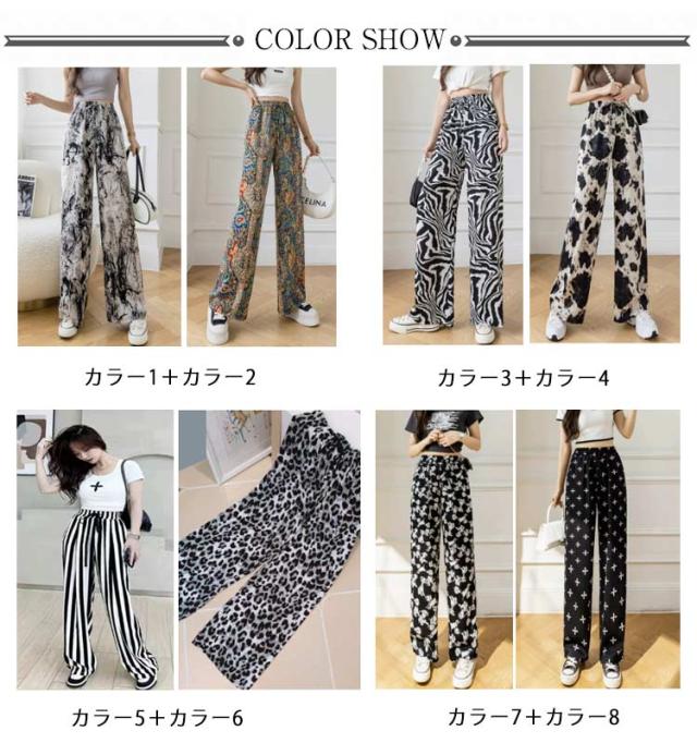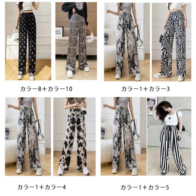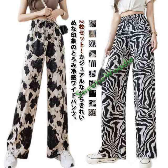ハイウエスト ワイドパンツ イージーパンツ 接触冷感 夏 ロング ヒョウ柄 ストライプ柄 ワイド 冷感 アイスシルクパンツ レディース とろみ 薄手 体型カバー 落ち感 ゴムウエスト 涼感 2枚セット 総柄 カジュアル ストリート おしゃれ