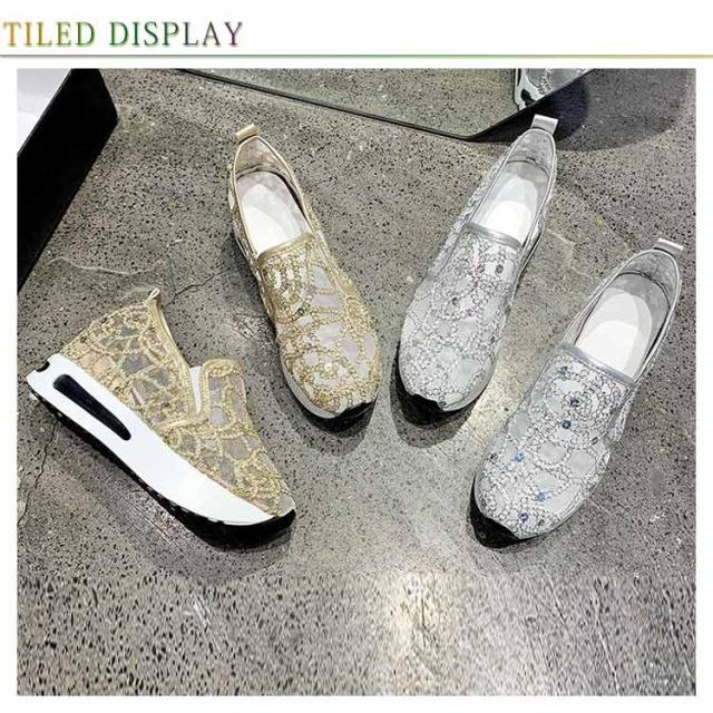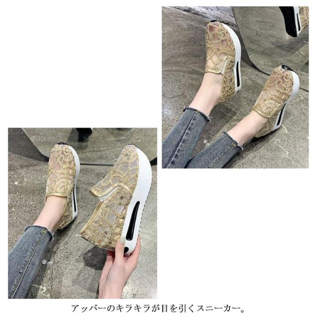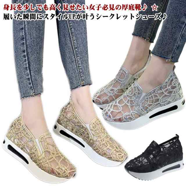 | 身長を少しでも高く見せたい女子必見の厚底靴♪ ☆履いた瞬間にスタイルUPが叶うシークレットシューズ♪ 大人女性にぴったり!履くだけでスタイルアップが叶うインヒールスニーカー♪ アッパーのキラキラが目を引くスニーカー。 メッシュ模様のデザインが上品とエレガントなスリッポンです。 メッシュで通気性も優れています。程よい厚底が美脚効果を発揮します。 アウトソールには滑り止め加工が施されているので、滑りやすい路面でも安心。 歩き疲れにくく歩きやすいローカットスリッポンです。 | |