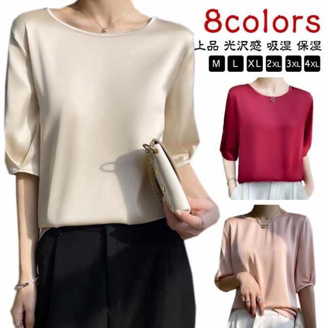 シルク 5分袖 シルクサテン レディース ブラウス 大きいサイズ 春 夏 半袖 シャツ クルーネック UVカット サテン シャツブラウス 上品 光沢感 吸湿 保湿 5分袖 大人 ツルツル 無地 シンプル