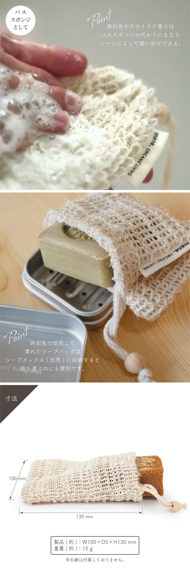 小さくなった石鹸を集めてソープバッグに入れると、最後まで無駄なく使い切ることができるサイザル麻とコットンを使用した「 ソープバッグ」。バススポンジの代わりになり旅行先にもオススメです。