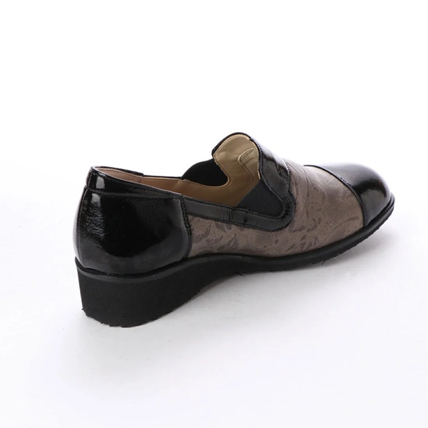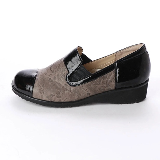 ボタニカル柄の型押しとエナメルコンビのコンフォートパンプスです。