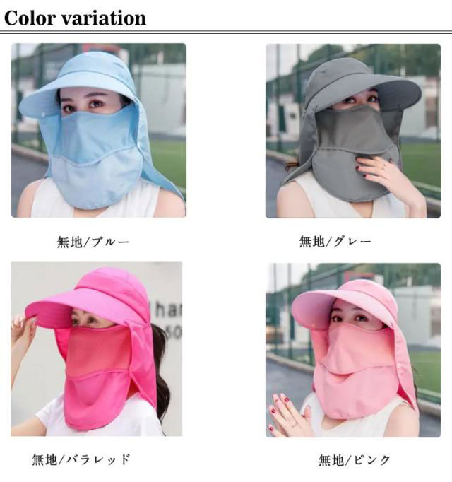 | フェイスカバー付きUV帽子 日差し、紫外線をカット!首のまわり、お顔周りも、360°全方面でカードしてくれます。 フェイスマスクはメッシュ生地を採用し、通気性がよく蒸れにくい、呼吸が苦しくないです。 程よい大きさのつば、日差しから目の周りを守って運動するは視界を邪魔しません。 カバー部分は取り外し可能、自由にアレンジ出来ます。 お出かけ、アウトドア、農作業、ガーデニングなど、幅広シーンで大活躍する。 | |