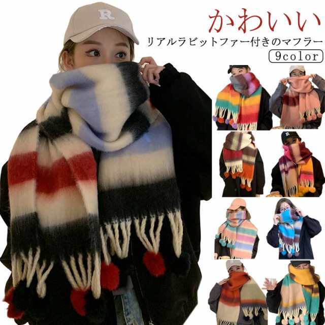 ポンポン付き マフラー 大判 ストール ボーダー柄 レディース 厚手 モヘア 大判ストール ボーダーマフラー ボリューム フリンジ かわいい おしゃれ ショール ひざ掛け 防寒 保温 大人可愛い 秋冬 誕生日 プレゼント ギフト 通勤 通学 学生 旅行 韓国風 【送料無料】