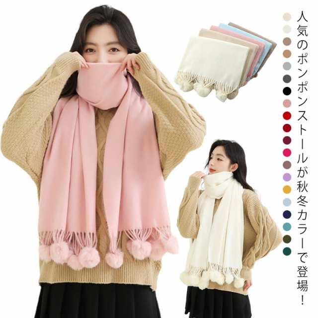 ポンポン付き ストール 大判 秋 冬 マフラー レディース ボンボン付き ウールタッチ カシミアタッチ フリンジ付き 冬 おしゃれ 暖かく 大人可愛い 結婚式 成人式 暖かい 羽織 寒さ対策 謝恩会 パーティードレス