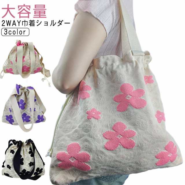 ニットバッグ トートバッグ ショルダーバッグ 巾着ポーチ 2way 花柄 大容量 ショルダー 巾着バッグ カジュアル 斜めがけ 手提げ 肩掛け 旅行 軽量 かわいい 可愛い 洗える 浴衣 和服