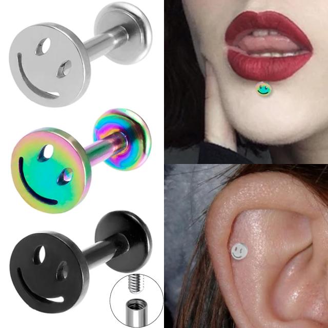 スマイルくんが大人カワイイボディーピアス。軟骨ヘリックスやトラガス、口ピアスのリップなどいろいろな場所に使えるボディーピアス。メンズでもレディースでも使えるオシャレなボディピアスはプレゼントやペアルックにも最適です。カラーも黒色ブラック、銀色シルバー、虹色レインボーから選べます。