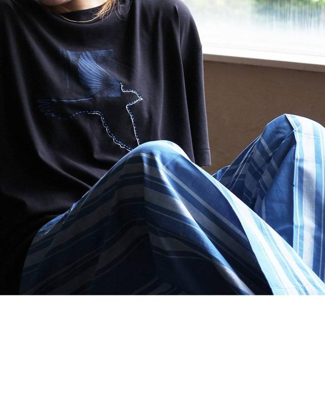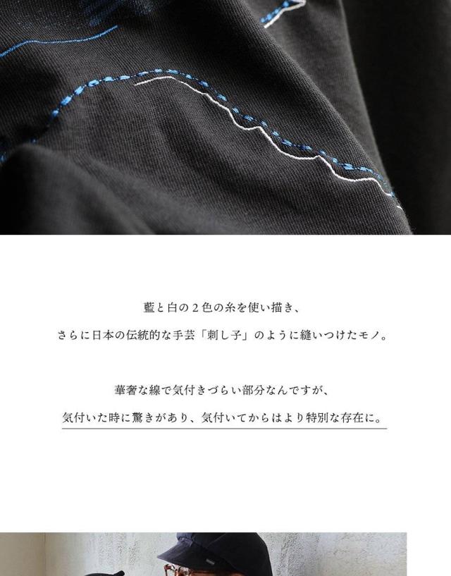 ・藍と白の2色の糸を使い描き、さらに日本の伝統的な手芸「刺し子」のように縫いつけたモノ。