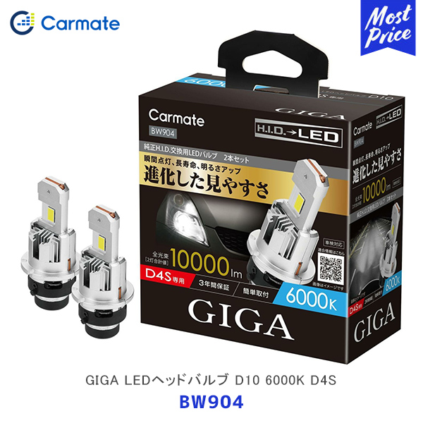カーメイト GIGA LEDヘッドバルブ D10 D4S 6000K【BW904】| carmate 車検対応 3年保証 ヘッドライト バルブ コンパクト 一体型構造 ワイド配光 ハイブリッド車 アイドリングストップ車対応