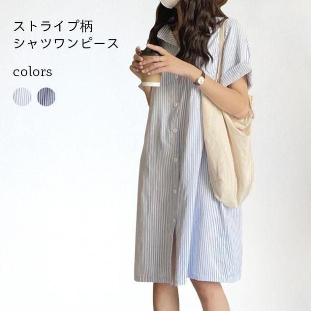 春 夏 シャツワンピース 半袖 夏 ロングシャツ ストライプ柄 レディース ワンピース ゆったり シャツワンピ 半袖ワンピース 大きいサイズ