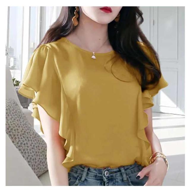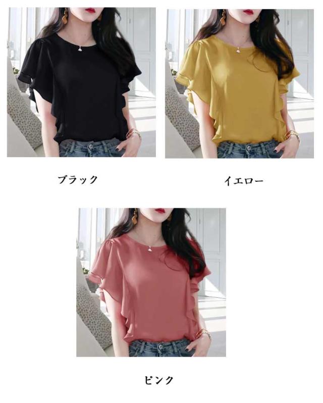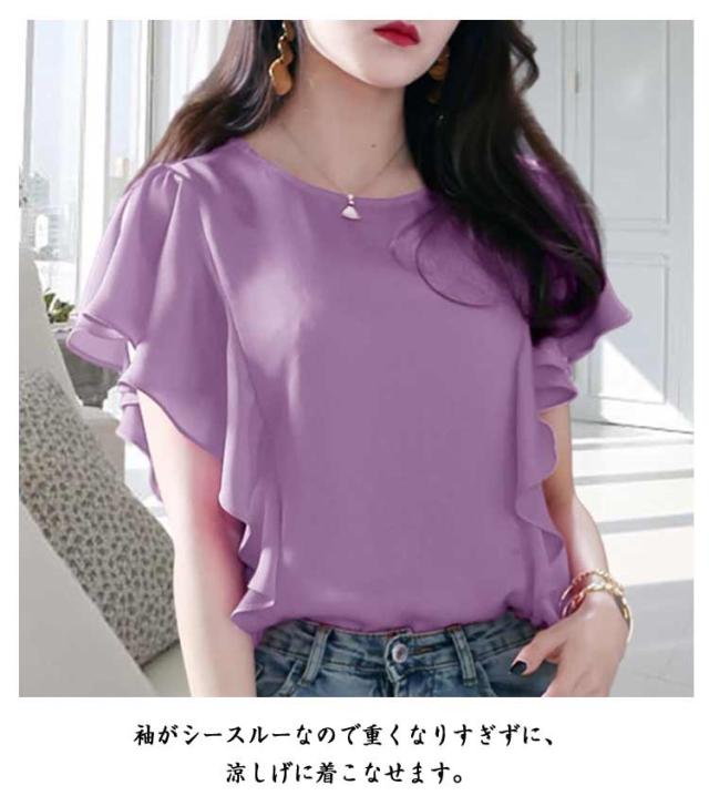 シフォン ブラウス シャツ フリル袖 半袖 チュニック 無地レース フリル袖カットソー シンプル クルーネック Uネック レディース 春 夏 結婚式 パーティー 二次会 トップス フォーマル 薄手 シースルー