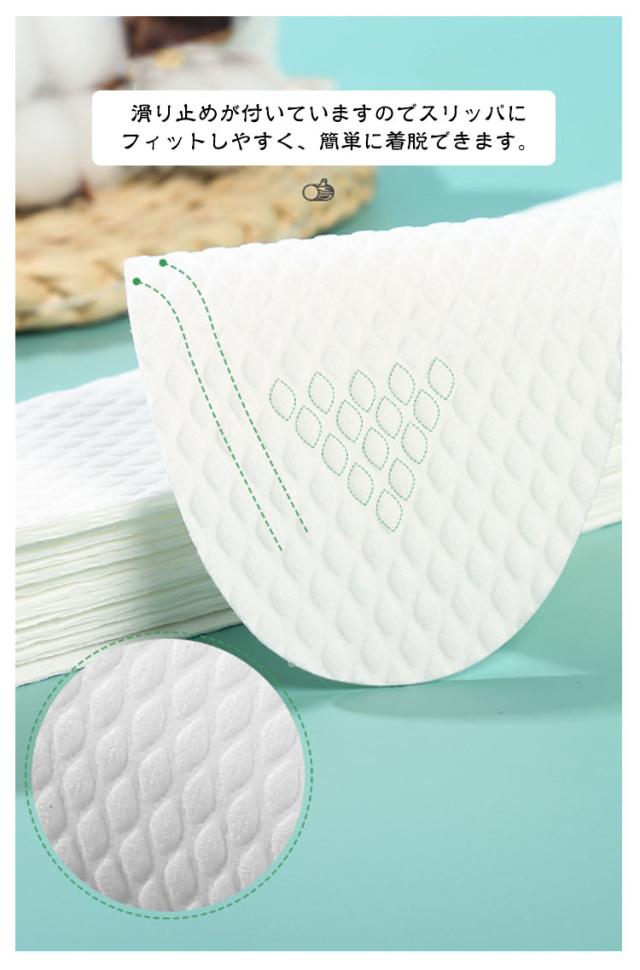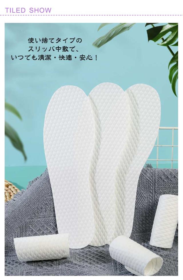 | 100枚入 50足分セット 使い捨てインソール。使い捨てタイプのスリッパ中敷で、いつでも清潔・快適・安心! 衛生的な使い捨てのスリッパ中敷です。 滑り止めが付いていますのでスリッパにフィットしやすく、簡単に着脱できます。 誰が履いたか分からないスリッパを履くのに抵抗がある方におすすめ! | |