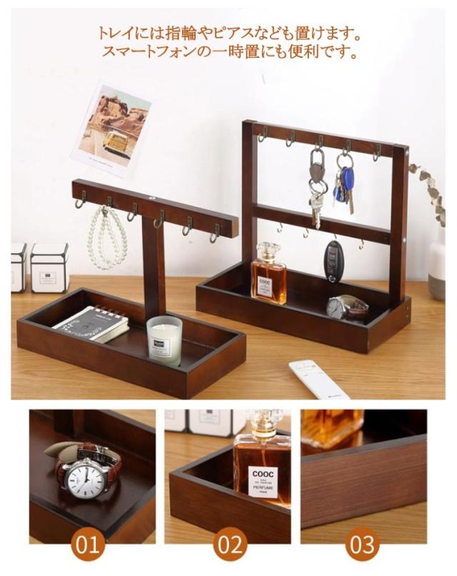 鍵かけ キーフック 木製 1段 2段 スリム 玄関用 トレー 小物入れ キースタンド 卓上収納 木目調 インテリア おしゃれ キー置き 腕時計置き メガネ置き 鍵置き アクセサリー収納 キーフックスタンド 卓上 インテリア