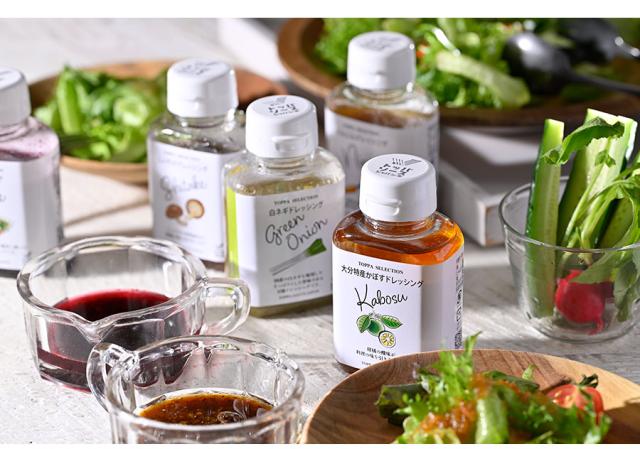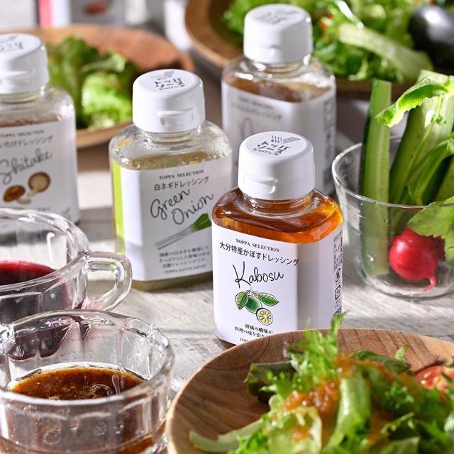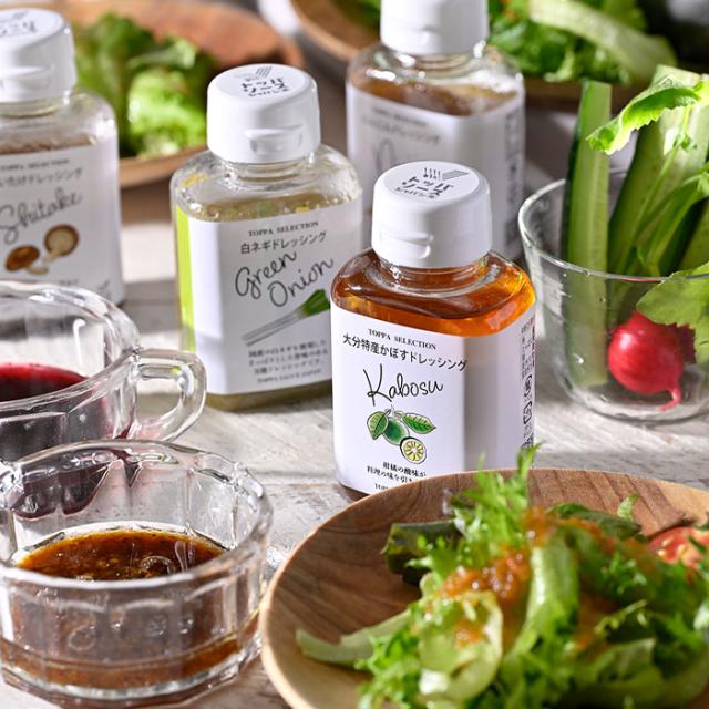 大分県の素材の恵みが詰まったドレッシング。爽やかな酸味で冷奴にも合う「かぼす」、冷菜系料理にもバッチリ&万能な「白ネギ」、滋味あふれる旨みが料理の味を引き立てる「しいたけ」など5種。いずれも素材感と香りが楽しく、サラダの表 情をガラリと変えてくれる。