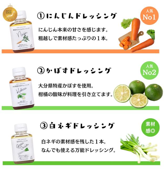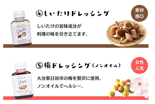 ○内容量:150ml×5(大分県産かぼすドレッシング、朝採れにんじんドレッシング、白ネギドレッシング、梅ドレッシング、しいたけドレッシング)
