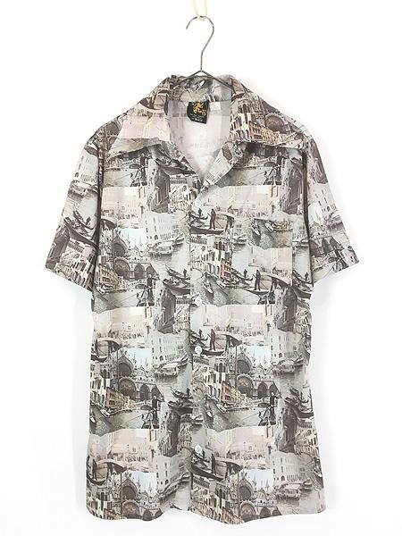 古着 70s LB 運河 ヨット フォト ピクチャー アート 総柄 半袖 開襟 ボックス ポリエステル シャツ M