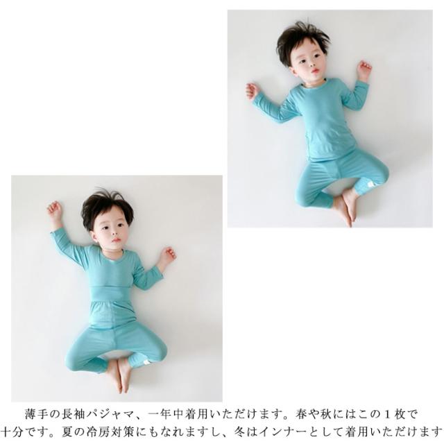 | 夏でも涼しく快適♪ 長袖腹巻付きパジャマセット。 柔らかくてひんやり涼しい肌触りが嬉しいポイントです。 お子様の繊細な肌をやさしく守りながら、ストレスフリーで快適な履き心地を提供します。 薄手の長袖パジャマ、一年中着用いただけます。春や秋にはこの1枚で十分です。夏の冷房対策にもなれますし、冬はインナーとして着用いただけます。 ズボンは腹巻付のハイウェストデザインをしており、赤ちゃんのお腹を寒さからしっかりと守ります。 夏の暑い日の家着としても重宝します。冷房が効きすぎの真夏でもお腹を冷やさずに安心。 | |