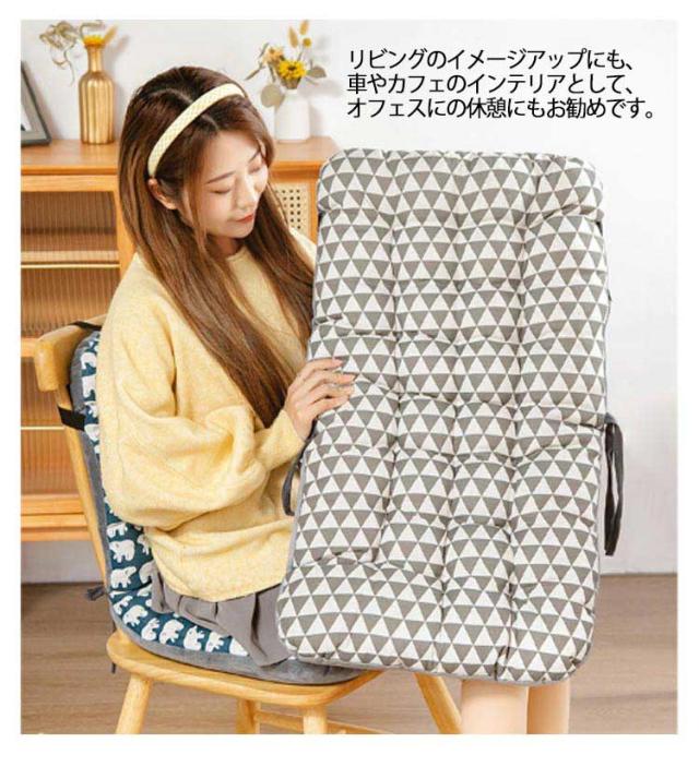 | 背もたれ付き 座面クッション 一体型 高品質の綿を厳選してふんわり感が優れています。 ふわふわで回復力も良い、長い間座っても変形しません。 表地や中身とも通気性、吸湿性や吸汗性が非常に良い、長時間快適さが続きます。 健康な素材で子供にも安心的にご使用頂きます。 落ち着いた配色でどんな部屋にもマッチやすい。リビングのイメージアップにも、車やカフェのインテリアとして、オフェスにの休憩にもお勧めです。 | |