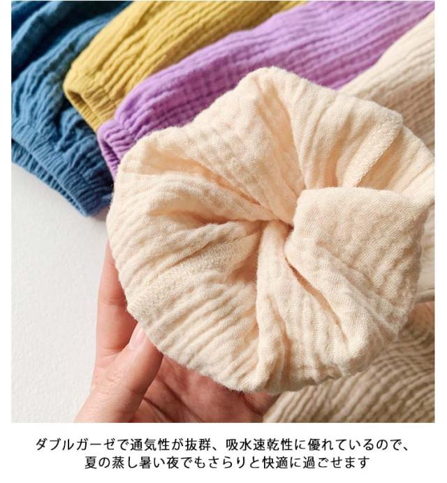 | 真夏でも涼しく履ける通気性の良い長ズボンです。 ダブルガーゼで通気性が抜群、吸水速乾性に優れているので、夏の蒸し暑い夜でもさらりと快適に過ごせます。 ウエストゴムで履き替えやすい、室内でもお出かけの場合も着られるラクチン♪ 春・秋はもちろん、夏のエアコンが効いた部屋でも活躍します。 家でも外でも‐普段の寝巻き、ルームウェアとしてはもちろん、保育園着にもおすすめ。 | |