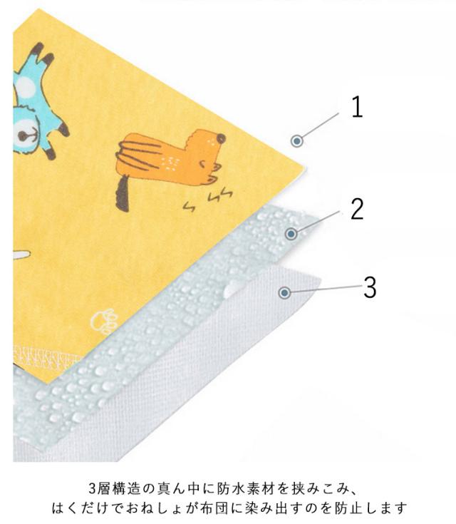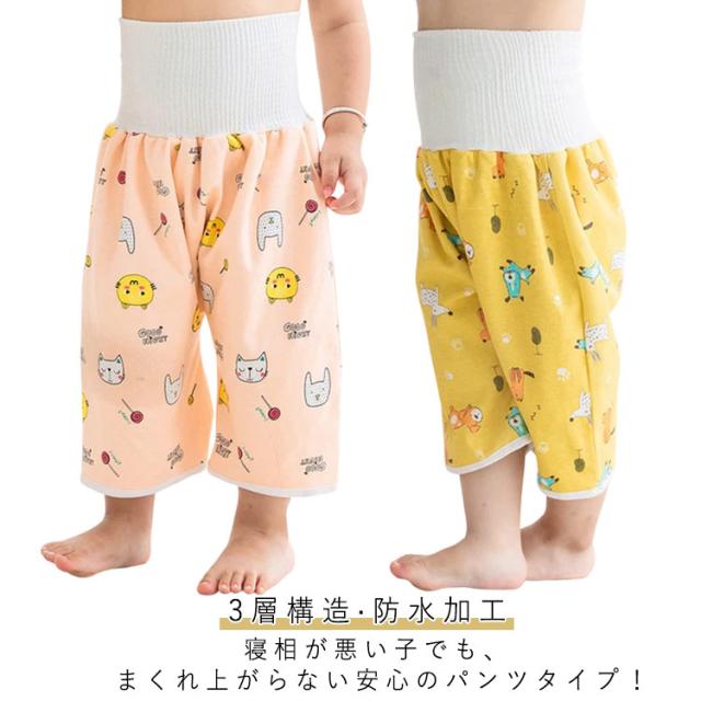 | 寝相が悪い子でも、まくれ上がらない安心のパンツタイプ! 3層構造の真ん中に防水素材を挟みこみ、はくだけでおねしょが布団に染み出すのを防止します。 裏地は肌触りの良いパイル生地で肌触りもやわらかで快適な使い心地です。 ウエストリブが長めなのでお腹周りをしっかりガードしつつ、程よい締め付けで快適な着心地! 洗濯機で洗っても型崩れしにくい!おねしょをしてしまった忙しい朝もサッと脱がせて丸洗いOK! トイレトレーニング中や旅行などのお泊りの時に活躍します。 | |