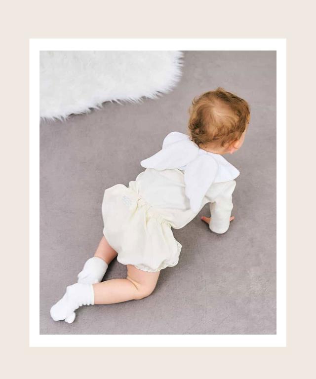 おおきな天使の羽がパッと目を引き、ハイハイする後ろ姿は思わず写真を撮ってしまうかわいさです。