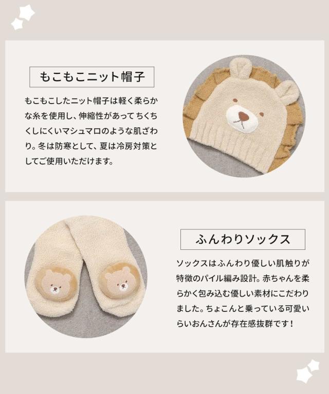らいおんモチーフの帽子・スタイ・ソックスの3点セット。