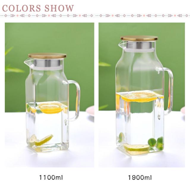 ガラスピッチャー 広口 耐熱ガラス 麦茶ポット 冷水筒 麦茶ポット 冷水ポット 大容量 1100ml ピッチャー 洗いやすい 1.9リットル 冷蔵庫 お茶ポット ティーポット スクエアサーバー 1900ml 耐冷 耐熱 ガラス 取っ手付き 水差し お茶 麦茶 ジュース