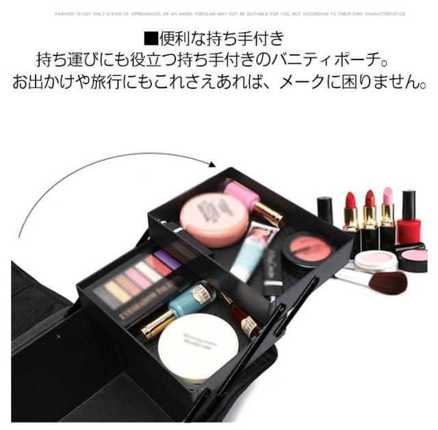 | ■たっぷり大容量! 広げると左右2段のトレイに、大きなメイン収納。 化粧用品やメイク道具がたっぷり収納できるメイクボックスです。 ■便利な持ち手付き 持ち運びにも役立つ持ち手付きのバニティポーチ。 お出かけや旅行にもこれさえあれば、メークに困りません。 ■ギフトや贈り物に すっきり収まるコスメ収納は、女性・男性問わずにお喜びいただける整理グッズです。 お友達の誕生日プレゼントや彼女へのクリスマス、バレンタイン、ホワイトデーのプレゼント、また兄弟・姉妹などご家族へのプチギフト、母の日、父の日、敬老の日など親しい方へのお祝いにオススメです。 | |