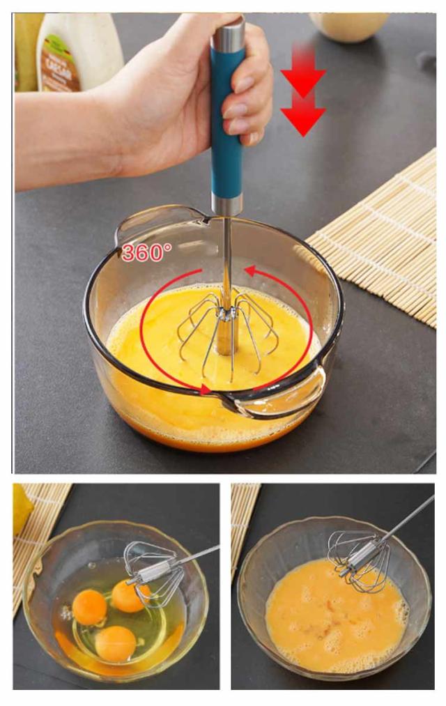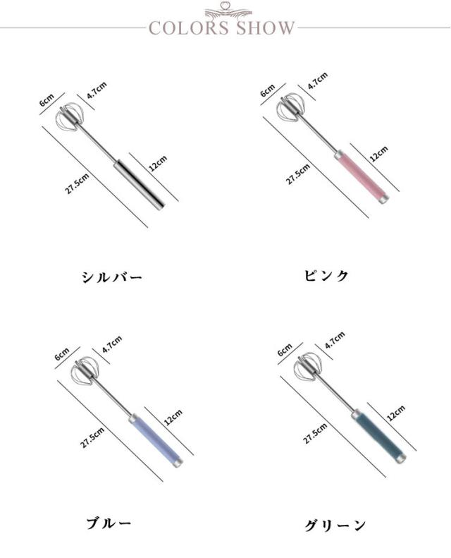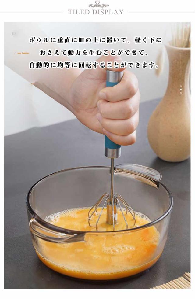| 押すだけ泡立て! 半自動泡立て器 2個セット ボウルに垂直に皿の上に置いて、軽く下におさえて動力を生むことができて、自動的に均等に回転することができます。 高品質ステンレス製、しっかりして錆びにくいです。 10本の高密度ワイヤーのデザインは、箸と普通の泡立て器に比べて、より高速で効率的です。 | |