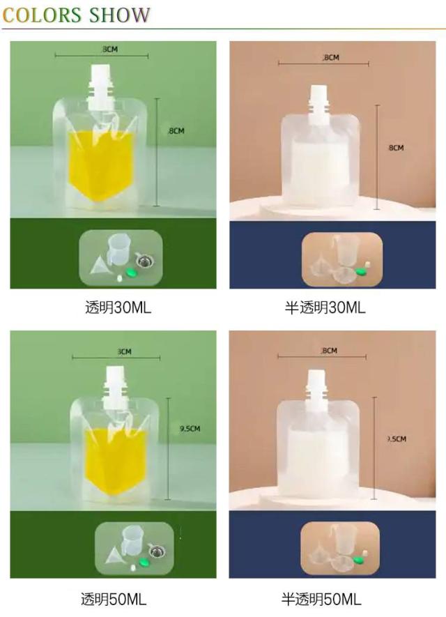 | 高温対応の使い捨て吸い口付きパウチ袋。 煎じた中薬、スープ、豆乳、ミルクティーなど様々な液体の保存・持ち運びに最適です。 食品級PE素材を使用し、液漏れしにくく、耐久性にも優れています。 吸い口付きで注ぐのも簡単、使いやすさ抜群。 ジュースバッグの底部は特別な独立したデザインを採用しており、耐荷重能力を効果的に高め、立体的なスペースをとらないため、テーブルやスタンドに飲み物を置くことができます。 軽くて持ち運びが簡単で、旅行、パーティー、キャンプ、アウトドア活動に非常に適しています。 サイズ展開も豊富で、業務用にも家庭用にもおすすめです。 | |