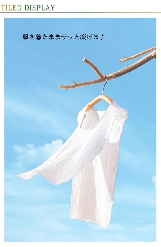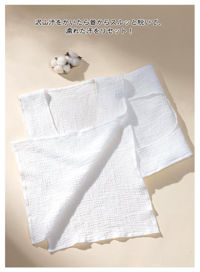 | 服を着たままサッと脱げる♪ 沢山汗をかいたら首からスルッと脱いで、濡れた汗をリセット! 吸水力の高い綿のダブルガーゼ、汗をしっかり吸込みます。 ふんわり柔らかい優しいガーゼ生地、着心地も◎ お出かけや通勤通学で背中の汗染みが気になる、汗をかいた後背中が冷たいなど汗で悩まされる様々なシーンに大活躍する汗取りインナーです。 襟開きの大きいUネック、スタイリングに邪魔せずに、スポーツやお出かけ時もお洒落。 | |