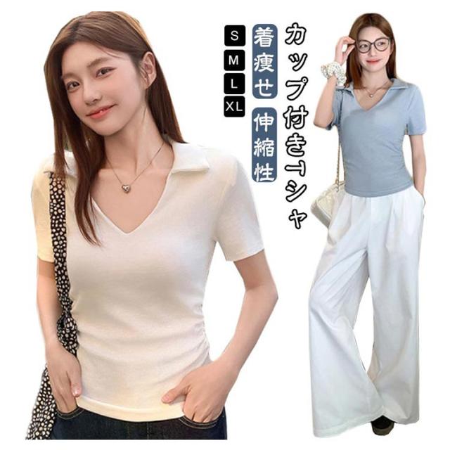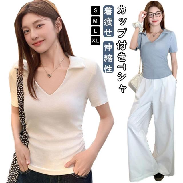 夏 カップ付きtシャツ パット付き tシャツ カップ付きTシャツ トップス カップ付き レディース Vネック おしゃれ Tシャツ 締め付けない ハーフネックポロカラー カットソー 無地 下着 ハーフネックポロカラー カットTシャツ トップス 夏 着痩せ