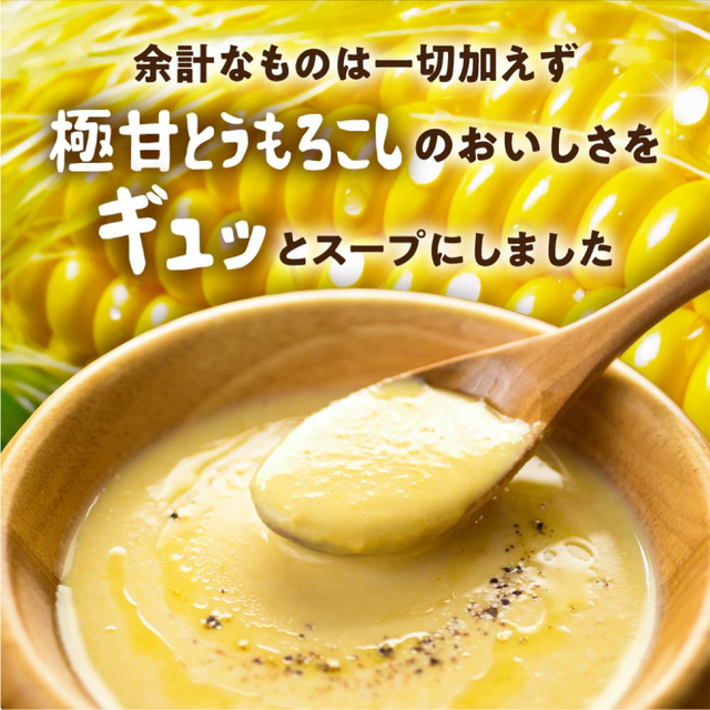 - 1袋に200mlの牛乳を混ぜるだけで、レトルトとは思えないとてもおいしいコーンスープができました。温めても冷やしても、とうもろこしの旨みが詰まっていてとてもおいしいです。原材料はとうもろこしと塩だけで...