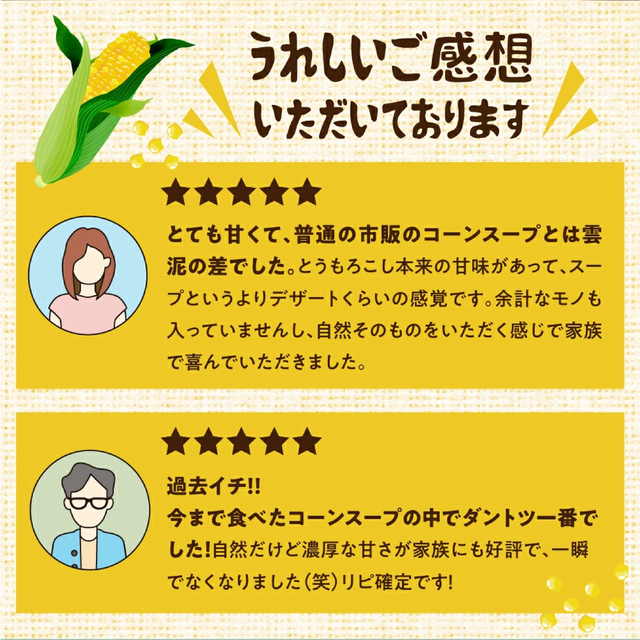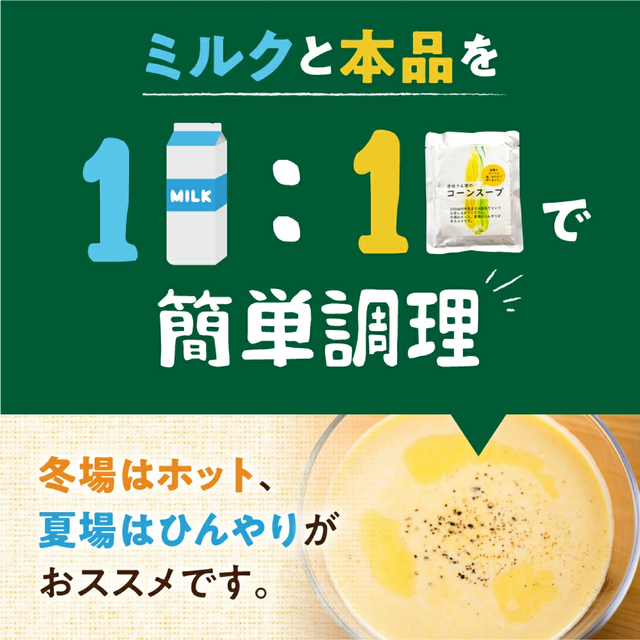 とうもろこしは生でも食べれる平均糖度20度の極甘とうもろこし。それを収穫したその日に冷凍してからスープに加工しています。作り方は簡単、牛乳や豆乳と混ぜるだけで完成です。小さなお子さんの料理のお手伝いに、忙しいお母さんの料理の時間短縮にも。夏は冷蔵庫で冷やした牛乳や豆乳で割ることで冷製スープ、冬はレンジで加熱すれば手軽にホッと一息。農業王国田原市で「食べた人が笑顔になれる」そんな野菜を目指して栽培しています。当農園自慢のとうもろこしを使ったコーンスープを飲んで、皆が笑顔になってくれたら嬉しいです。